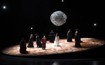 随着老王鬼魂的出现,宫廷内幕的揭开,谋杀罪行的暴露,王子心中烈火的燃起,悲剧的帷幕拉开了……面对阴险奸诈的新王,哈姆雷特开始了孤身复仇的行动:为了复仇,他失手杀死了恋人的父亲;为了复仇,他佯装疯狂失去了深爱的情人;为了复仇,他对软弱的母亲冷言相向;为了复仇,他忍受着失去友情的痛苦。最后,在一场血淋淋的宫廷决斗中,他虽然杀死了阴险狡诈的新王,但自己的生命也结束在这“牢狱”般的宫廷中。